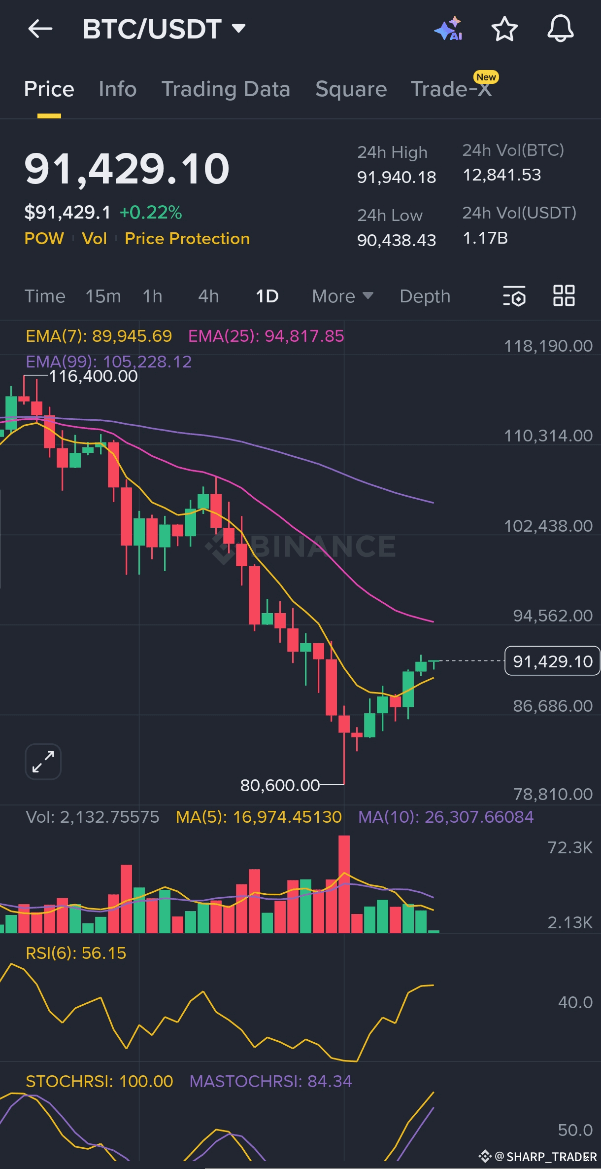 Price โ $91,429 (above EMA7)