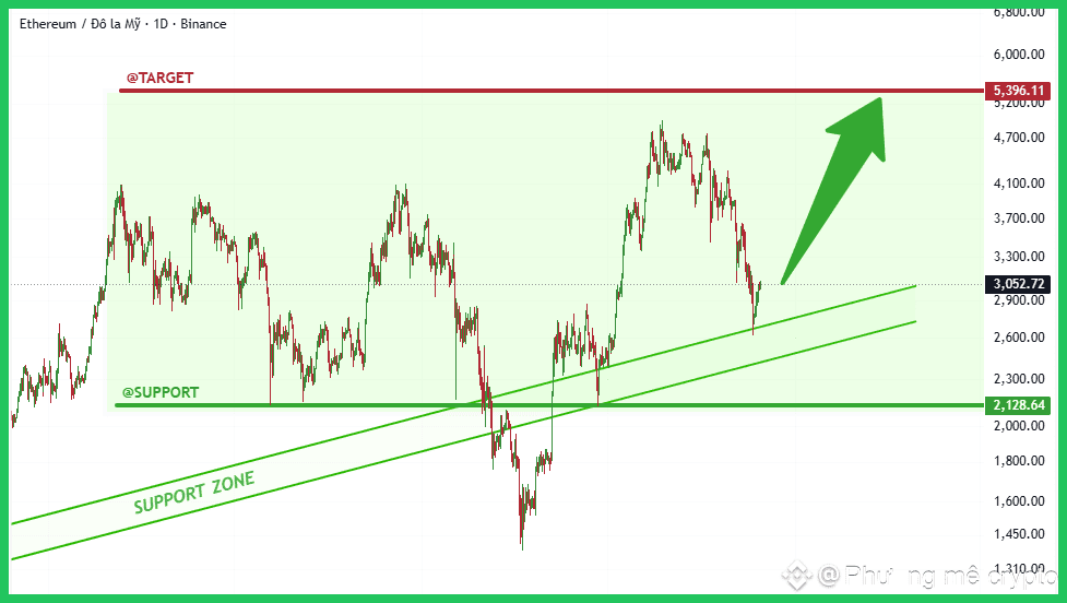 Ok anh em, cùng mổ xẻ chart $ETH cực ngon này xem có gì hay ho không nhé. Sau cú điều chỉnh vừa qua, Ethereum đã cho thấy sức mạnh đáng kinh ngạc khi tạo ra một cây nến tăng mạnh từ vùng hỗ trợ. Trên khung 1D, ETH/USDT vừa tìm thấy lực mua cực lớn tại khu vực hỗ trợ động của kênh tăng giá. Vùng SUPPORT ZONE quan trọng nằm trong khoảng 2,600 USD đến 2,900 USD đã giữ vững. Hiện tại, giá đang giao dịch quanh 3,052 USD. Nếu giữ được trên mốc 3,000 USD, mục tiêu tiếp theo sẽ là kháng cự cũ khoảng 4,100 USD, và mục tiêu cuối cùng là đỉnh cao 5,396 USD.