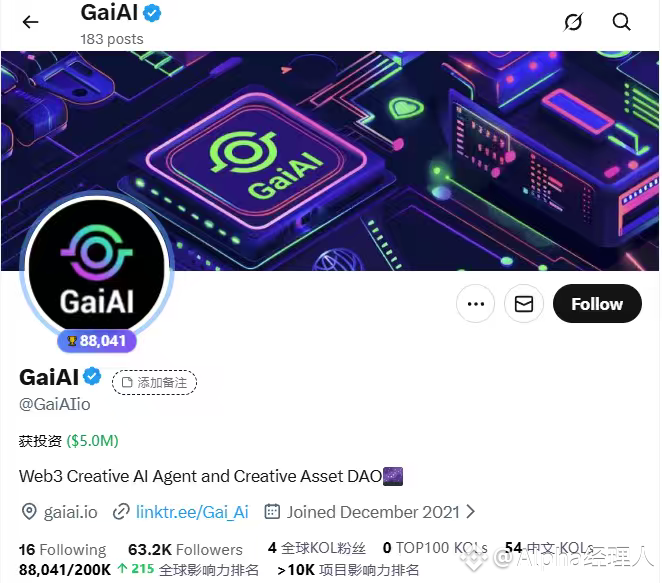 项目简介:GaiAi 是一个去中心化创意 AI 代理,主打链上视觉创作、版权归属与收益共享的新范式。