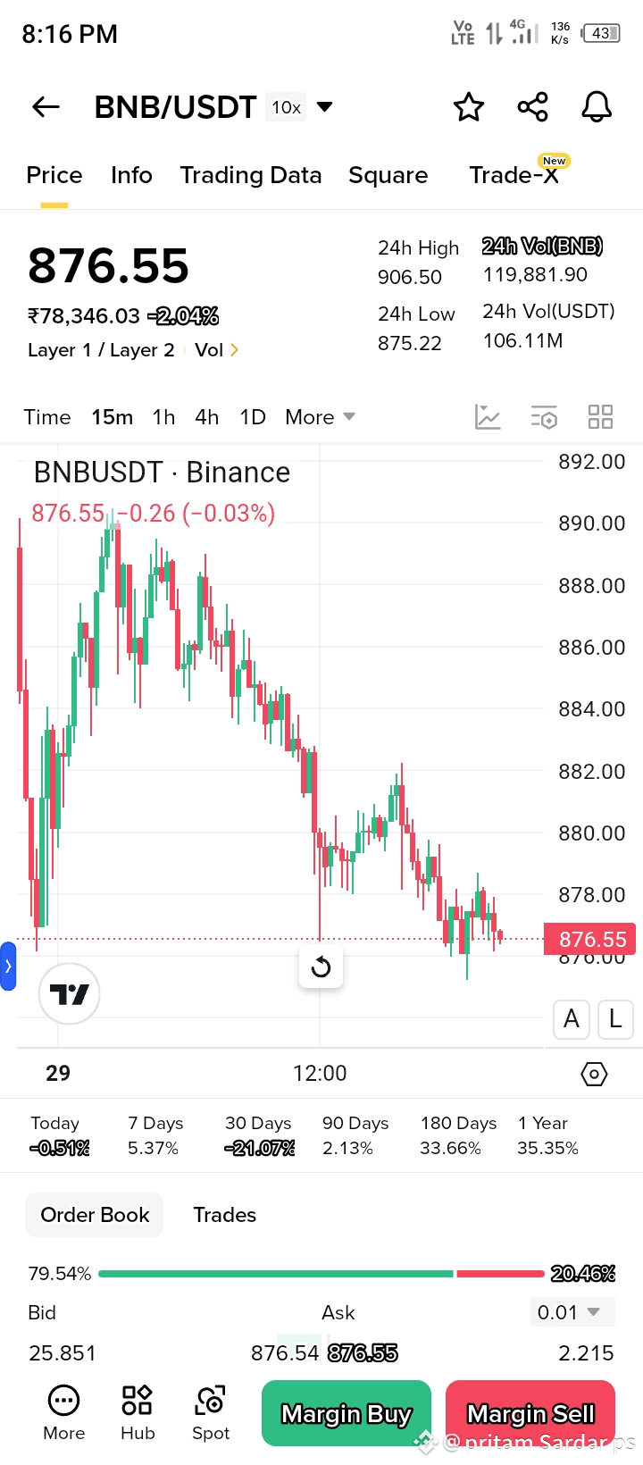 The screenshot shows the BNB/USDT trading pair on Binance with the price at $876.55, slightly down by 0.03%. The 15-minute chart displays a clear downtrend, as the candles show lower highs and lower lows throughout the session.