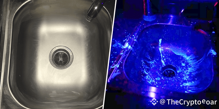 Despite being 'cleaned' after washing raw chicken, this sink remained contaminated, as revealed under specific lighting (bright spots in image on right). (Lisa Shelley/NC State University)