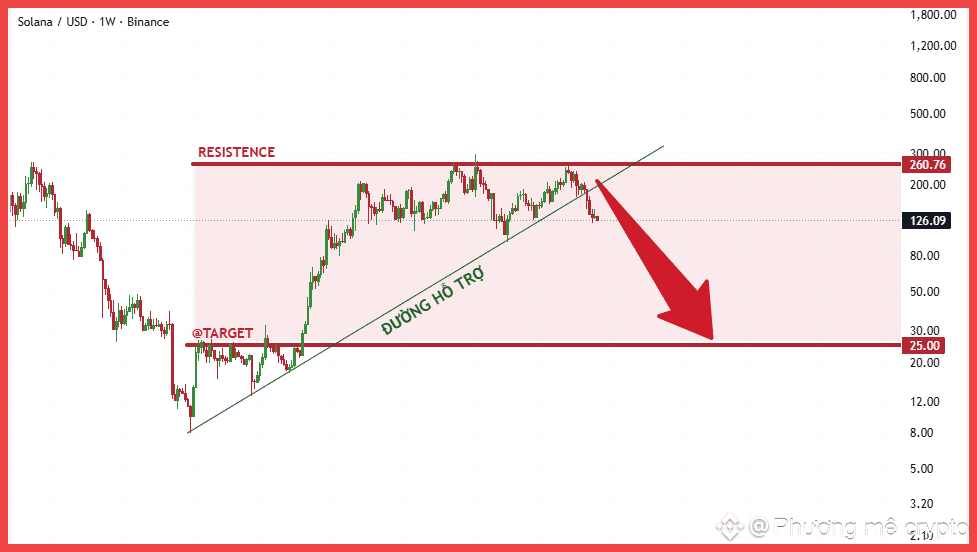Biểu đồ tuần cho thấy SOL đã thất bại trong việc giữ vững đường hỗ trợ xu hướng tăng kéo dài từ đáy. Giá hiện tại ($126.09) đã phá vỡ đường hỗ trợ quan trọng này một cách dứt khoát. Đây là một tín hiệu cực kỳ tiêu cực, xác nhận rằng phe Gấu (Bears) đã nắm quyền kiểm soát thị trường dài hạn.