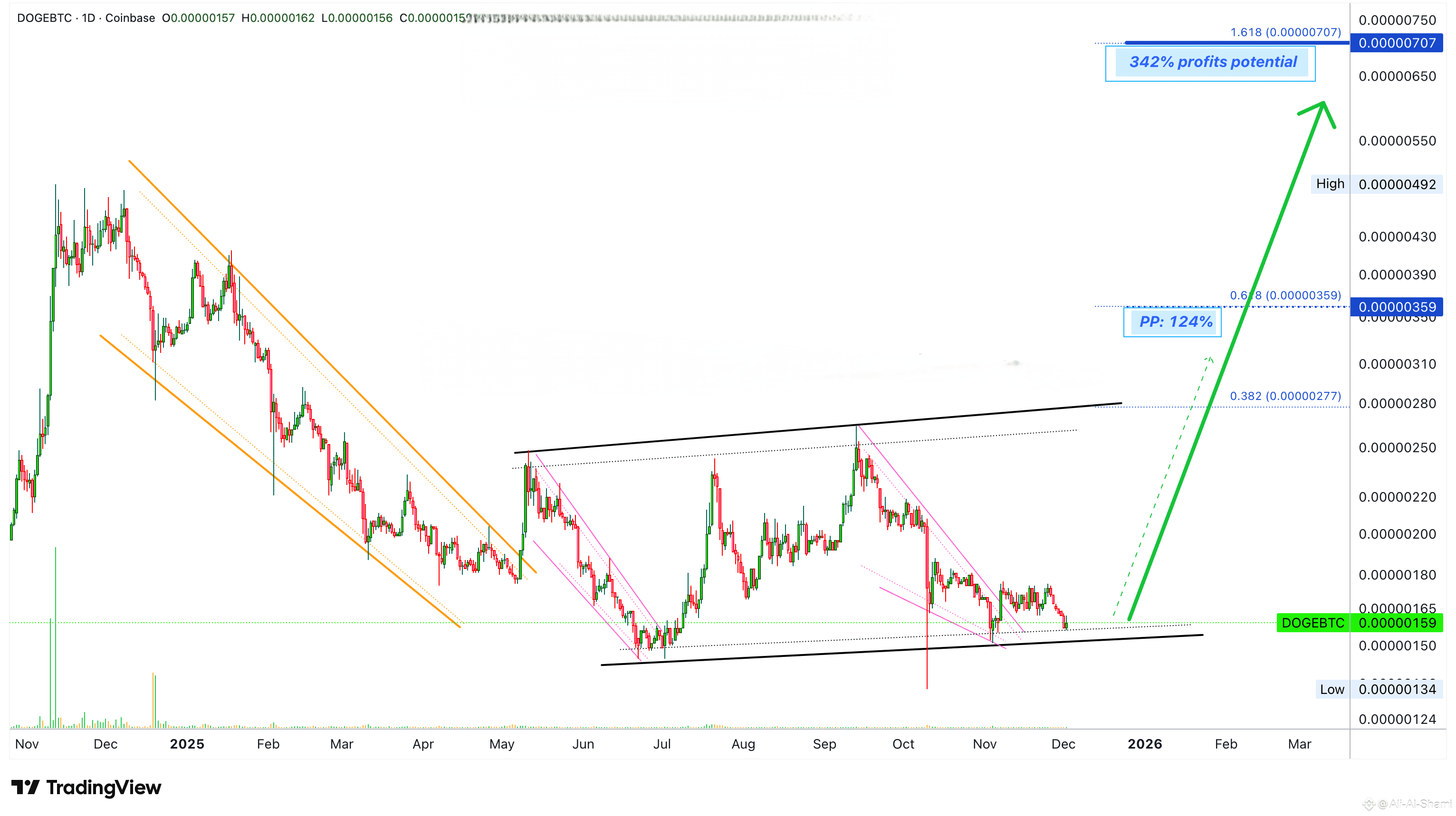 عندما أقول 'سهل' أعني ذلك... لقد نظرنا بالفعل إلى DOGEBTC على المدى الطويل (انظر هنا)، الإمكانية الإجمالية للنمو ضخمة. إعداد المخطط الجديد هذا على الإطار الزمني اليومي يركز أكثر على المدى القصير إلى المتوسط. يركز أكثر على الآن. ديسمبر 2025 وقد حتى يناير وفبراير 2026. نحن نسير نحو الأخضر.
