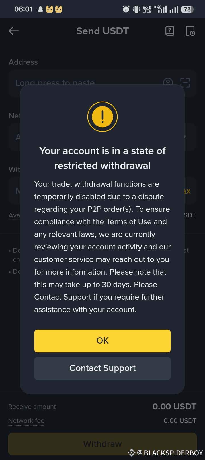 Today, while trying to send USDT from my Binance account, I received an alert saying that my account is currently in a state of “restricted withdrawal.” According to the message, my trading and withdrawal functions have been temporarily disabled because of a dispute related to one or more of my P2P orders. Binance has also informed me that they are now reviewing my account activity to ensure compliance with their Terms of Use and relevant laws.