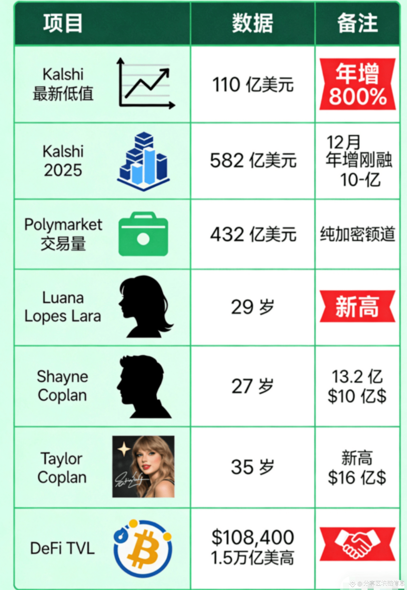 这些“新贵”多源于预测+加密交叉:Polymarket交易量翻3倍,Kalshi扩展至140国。行情信号+1:比特币破10万美元,DeFi TVL超1万亿,预测市场或成下一个万亿赛道。