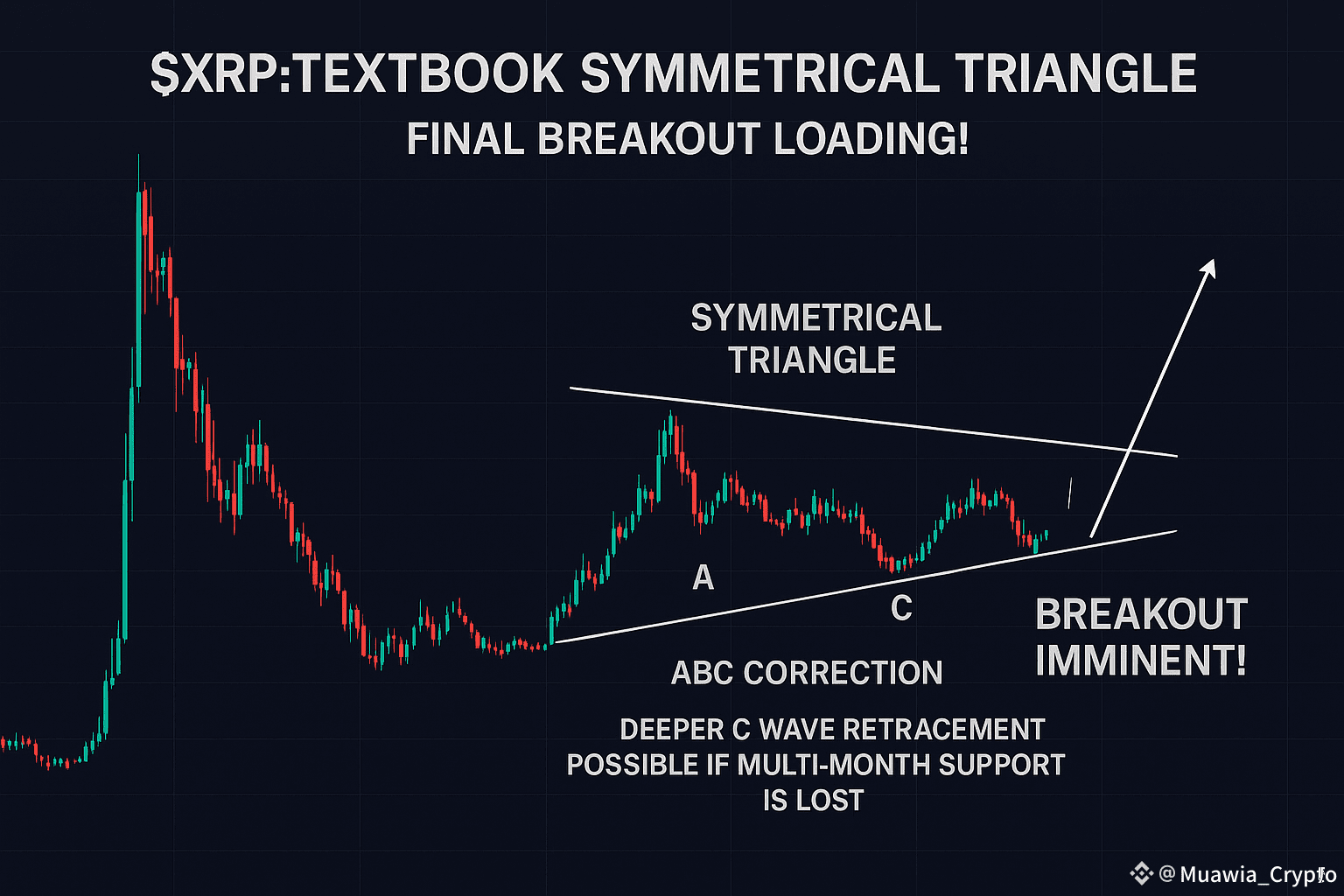 After years of consolidation, $XRP is now coiling within one of the most technically significant formations in its history — a textbook Symmetrical Triangle, signaling that the asset is in the final compression phase before a potential macro-scale breakout.