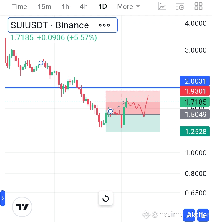অন্যদিকে, Sell Zone সাধারণত সেই জায়গা যেখানে দাম উঠে গিয়ে বারবার থেমে যায়। SUI-র জন্য $1.74–$1.85 একটি medium-term resistance, যেখানে profit-booking দেখা যায়। এর পরের বড় Sell Zone হলো $2.00–$2.05। এটা একটি round-number resistance, যেটি ট্রেডারদের মানসিকভাবে প্রভাবিত করে। দাম যদি এখানে গিয়ে force হারায়, তাহলে correction আসার সম্ভাবনা থাকে। আরও আগাম লক্ষ্য $2.20–$2.30—যা শুধু strong trend-এ possible।