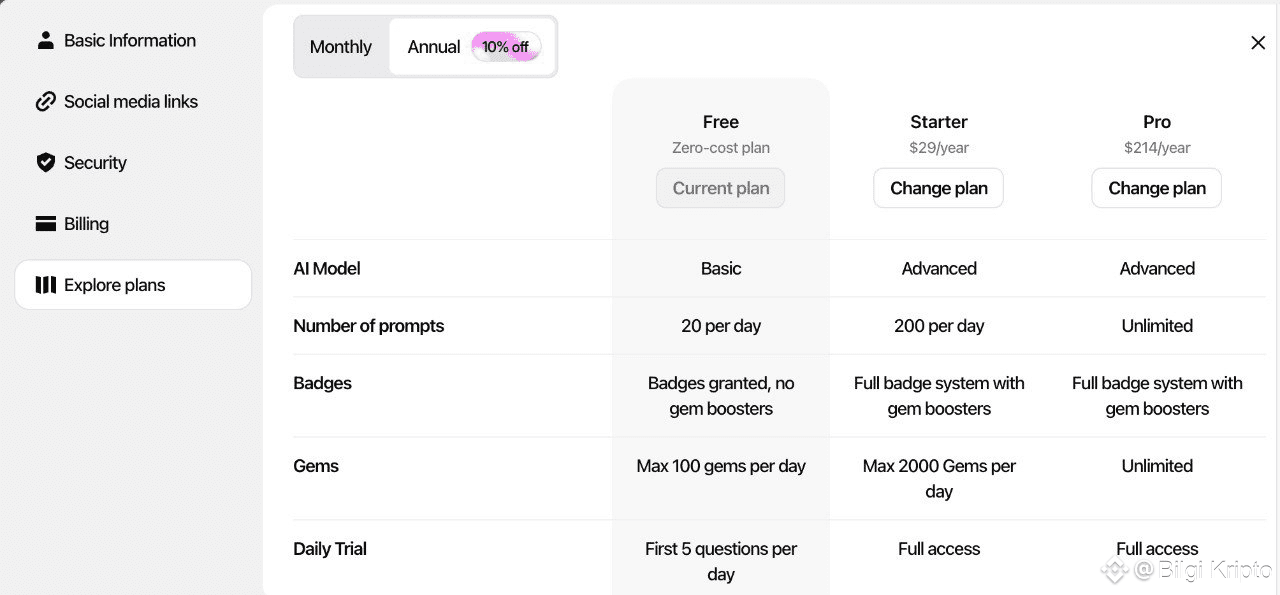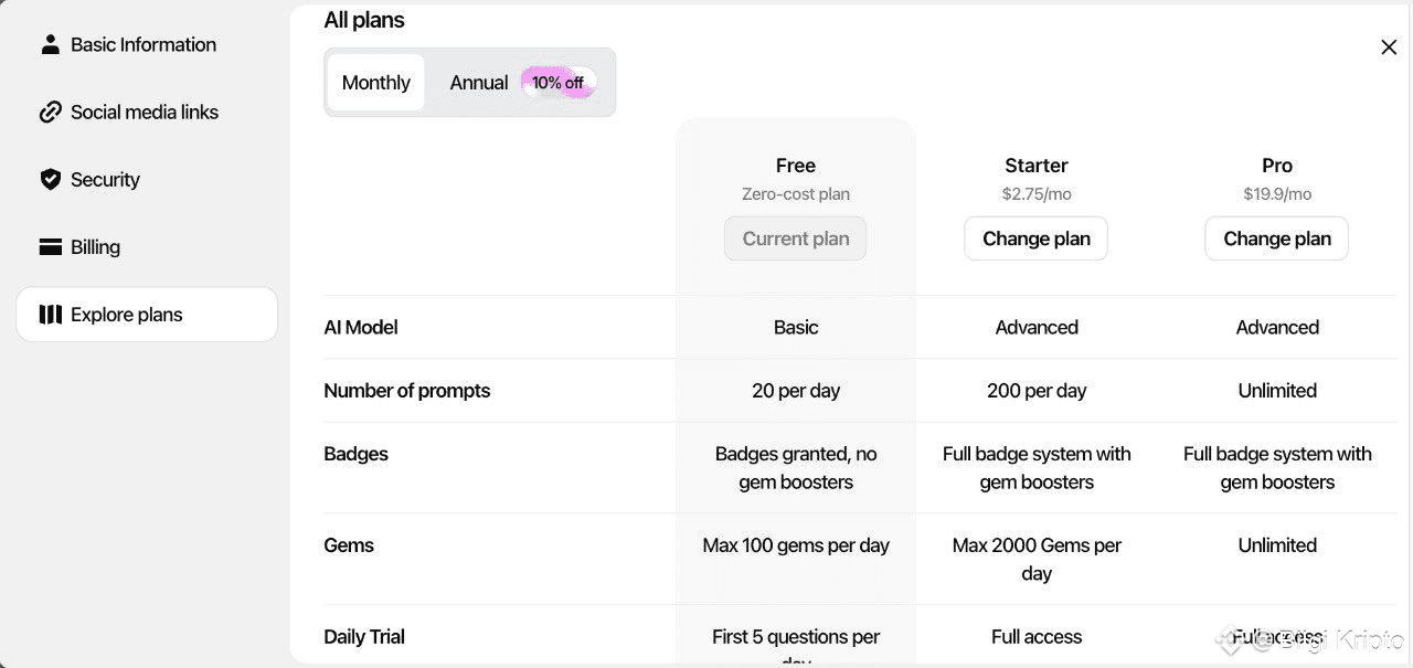 Free plan, temel kullanım senaryoları için yeterlidir ancak soru, gems ve analitik kısıtlamaları zamanla sınırlayıcı hâle gelir. Kriptoya yeni başlayan veya Zero Chat’i denemek isteyenler için uygundur.