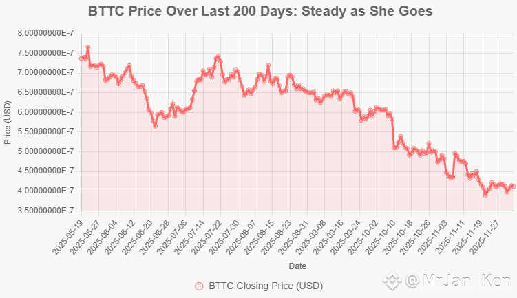 Why the chill? BTTC's been consolidating in a tight range, like a gamer grinding side quests before the boss fight. Volume's been modest (think cozy coffee shop, not raging rave), and external factors – like Bitcoin's ETF drama and regulatory whispers – have kept it from mooning. But here's the fun part: Over the last 200 days, it's shown resilience, bouncing off supports around $0.00000040 like a digital trampoline.