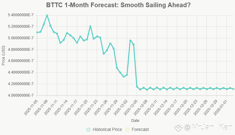 Picture this: BTTC started 2025 like a sleepy sloth on caffeine – hovering around $0.00000074 (that's 7.4e-7 USD for the math nerds). It dipped, it danced, it even flirted with a mini-rally in July, peaking near $0.00000084 before gravity (and market bears) pulled it back down. Fast-forward to now, and our hero's chilling at $0.000000412 – a solid 44% drop from January highs, but remarkably steady amid the crypto chaos.