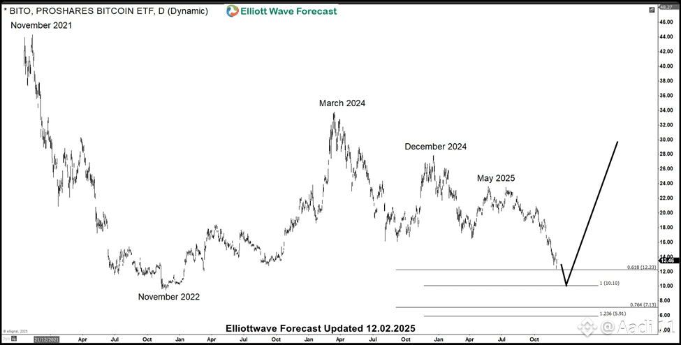 This chart highlights how closely Bitcoin ($BTCUSD) tracked BITO (ProShares Bitcoin ETF) from the November 2022 low to the March 2024 high. While the two assets appear to diverge after March 2024, a closer inspection reveals that Bitcoin continued to follow BITO’s directional path, albeit with a different magnitude of swings. This divergence in amplitude allowed Bitcoin to extend its rally all the way to the October 2025 high, even as BITO began its corrective phase. The recent decline in Bitcoin suggests that it has now completed its cycle from the November 2022 low, and is entering a broader corrective phase. Importantly, this correction is expected to persist until BITO reaches its extreme area near $10.10—a level derived from the 100% Fibonacci extension of the first leg down from the March 2024 peak, projected from the December 2024 peak.