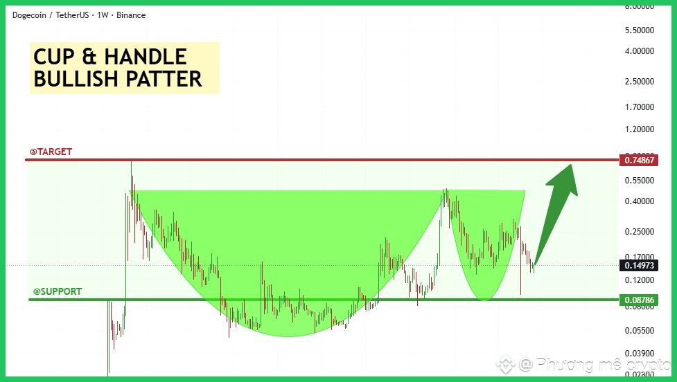 Trên khung thời gian 1W, $DOGE đã hoàn thành phần "Cup" và đang trong quá trình tạo phần "Handle" (tay cầm) ở vùng giá hiện tại. Đây là một mô hình tiếp diễn xu hướng tăng cực kỳ mạnh mẽ, thường dẫn đến mục tiêu cao bằng độ sâu của chiếc cốc. Vùng hỗ trợ cứng cần chú ý là $0.08786. Nếu giá phá vỡ và đóng nến trên đường viền cổ hiện tại (khoảng $0.17 - $0.20), mục tiêu tiềm năng theo mô hình sẽ là vùng kháng cự lịch sử $0.74867.