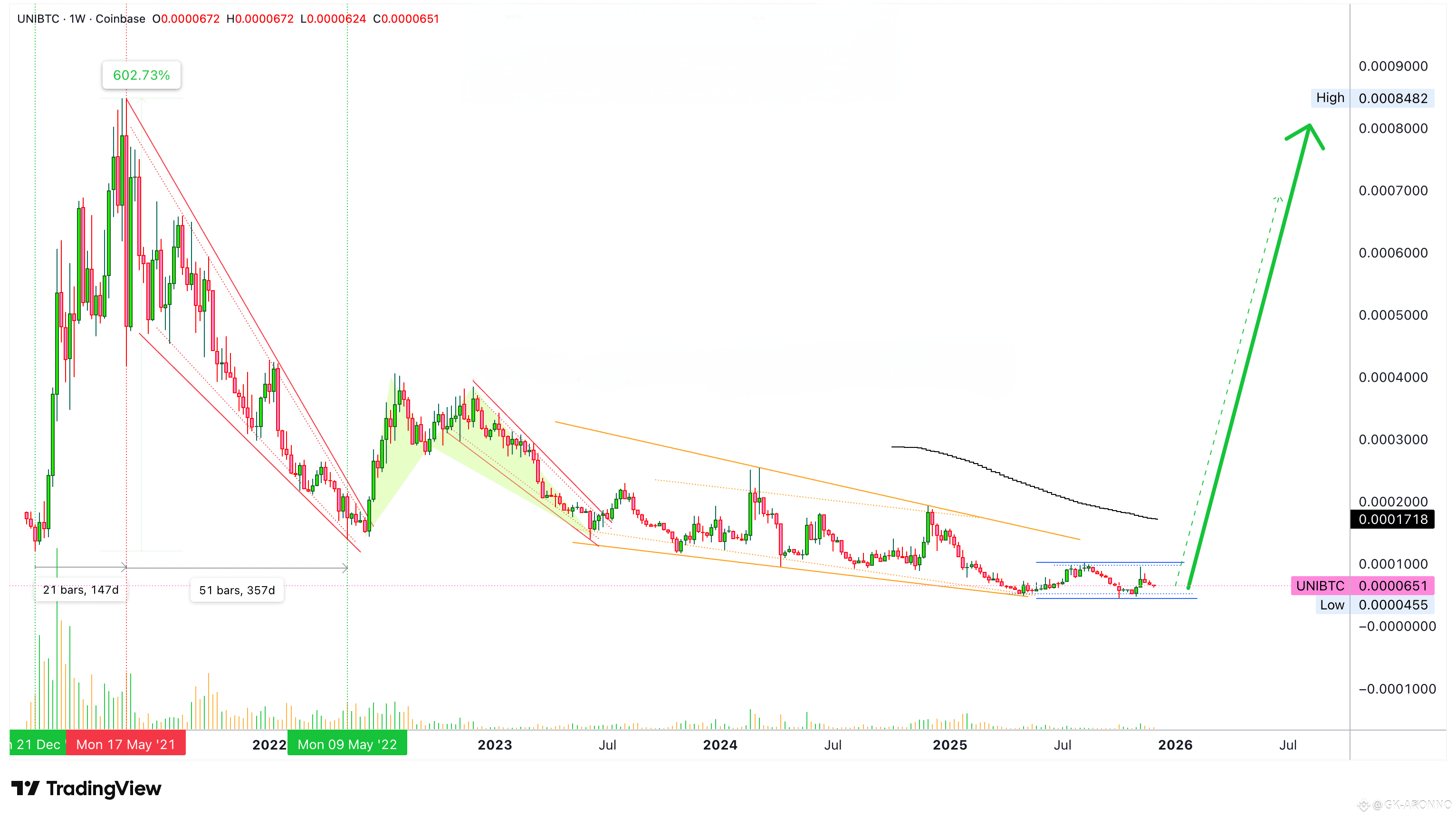 UNIBTC grew a little more than 600% in its previous bullish cycle. The market then entered a strong correction, a bear market, then it went sideways long-term with a downward bent, with lower lows. This led to the current chart.