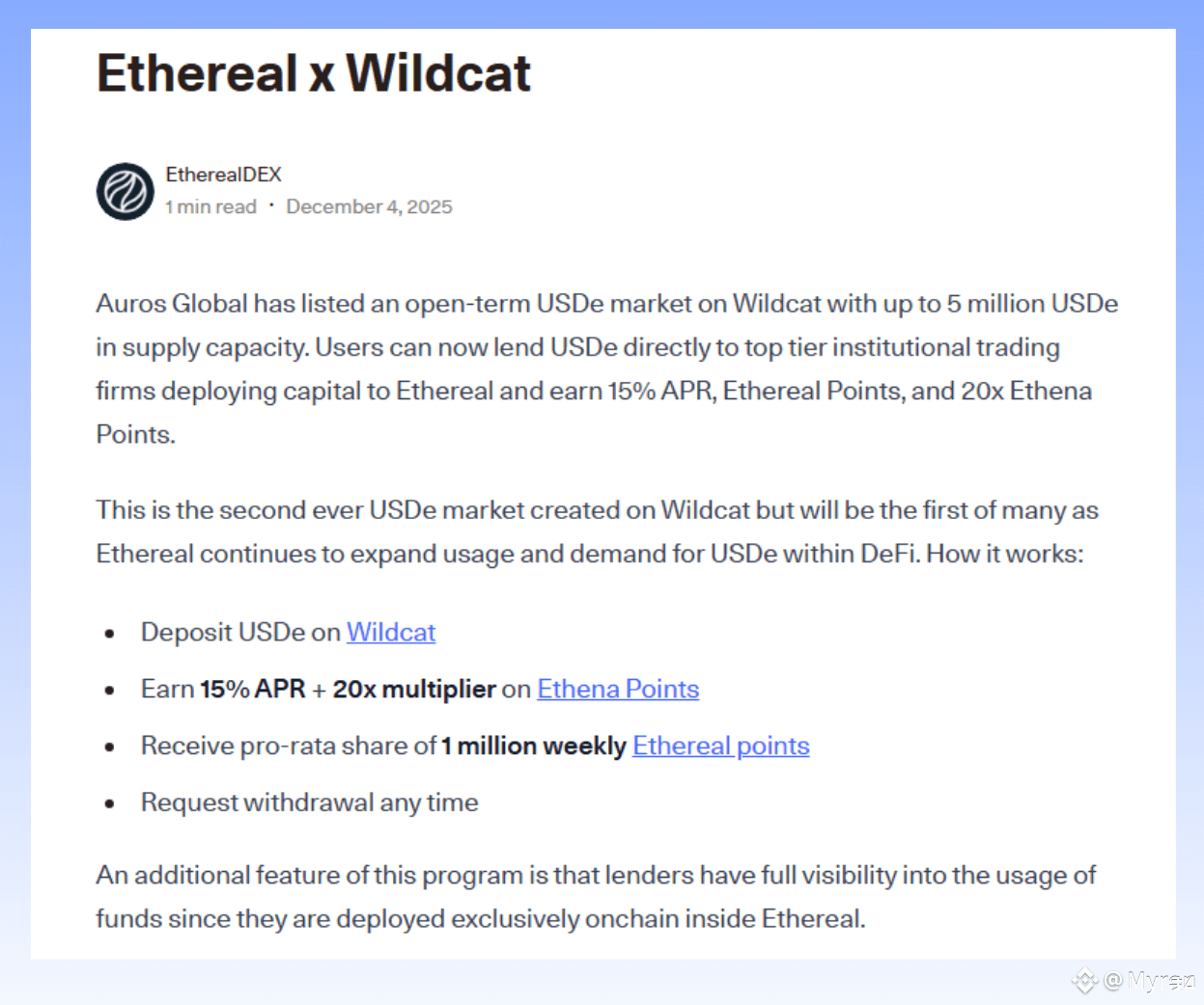 昨天(12/4)看到Ethereal官推介紹,Auros在Wildcat開設高達15% APR(已上調至18%)的USDe貸款利率,並且還能獲得Ethereal&Ethena空投積分。