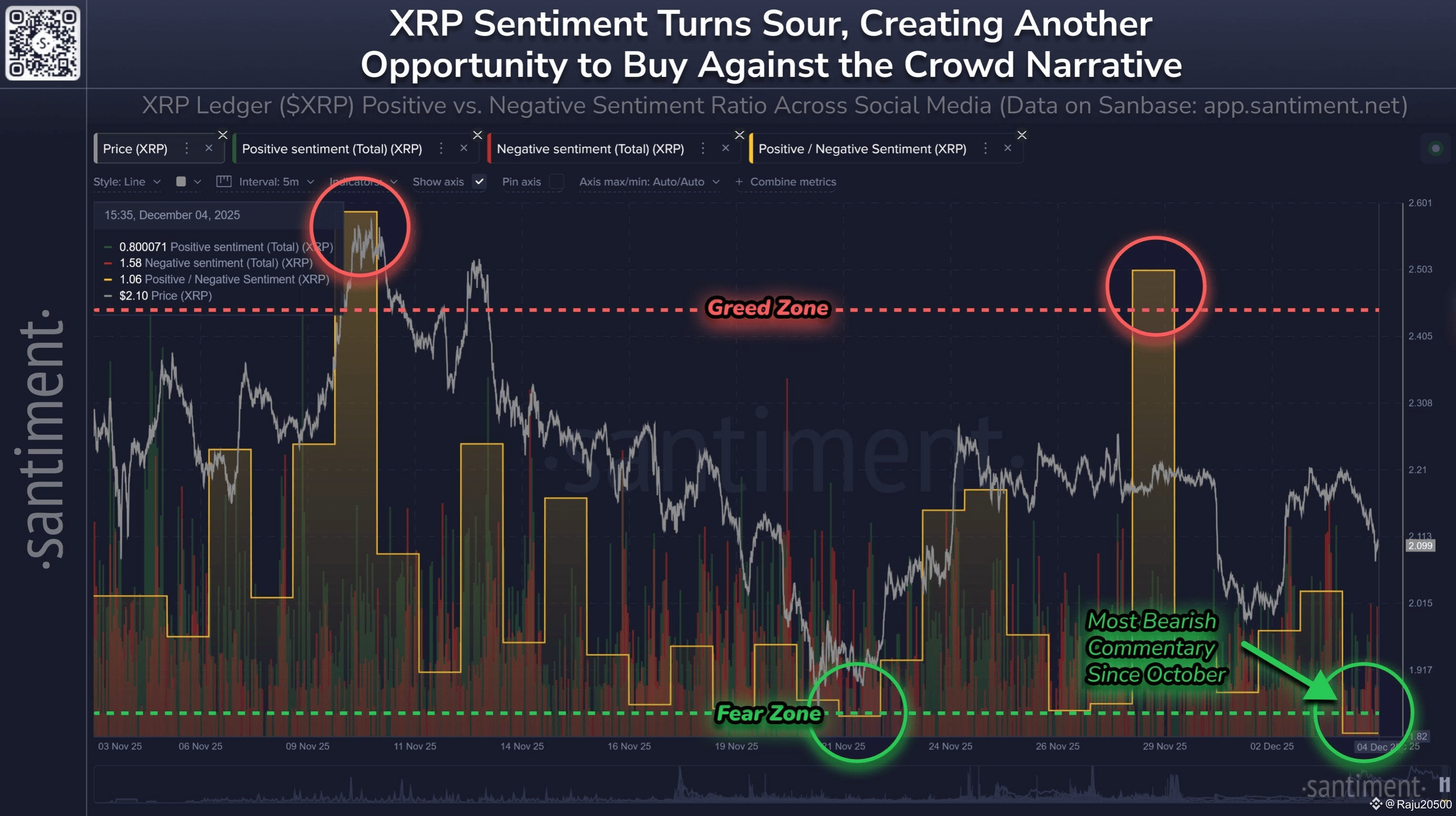 Santiment's sentiment model indicates XRP is in a 'fear zone,' where negative commentary significantly outweighs positive talk, potentially influencing market positioning.