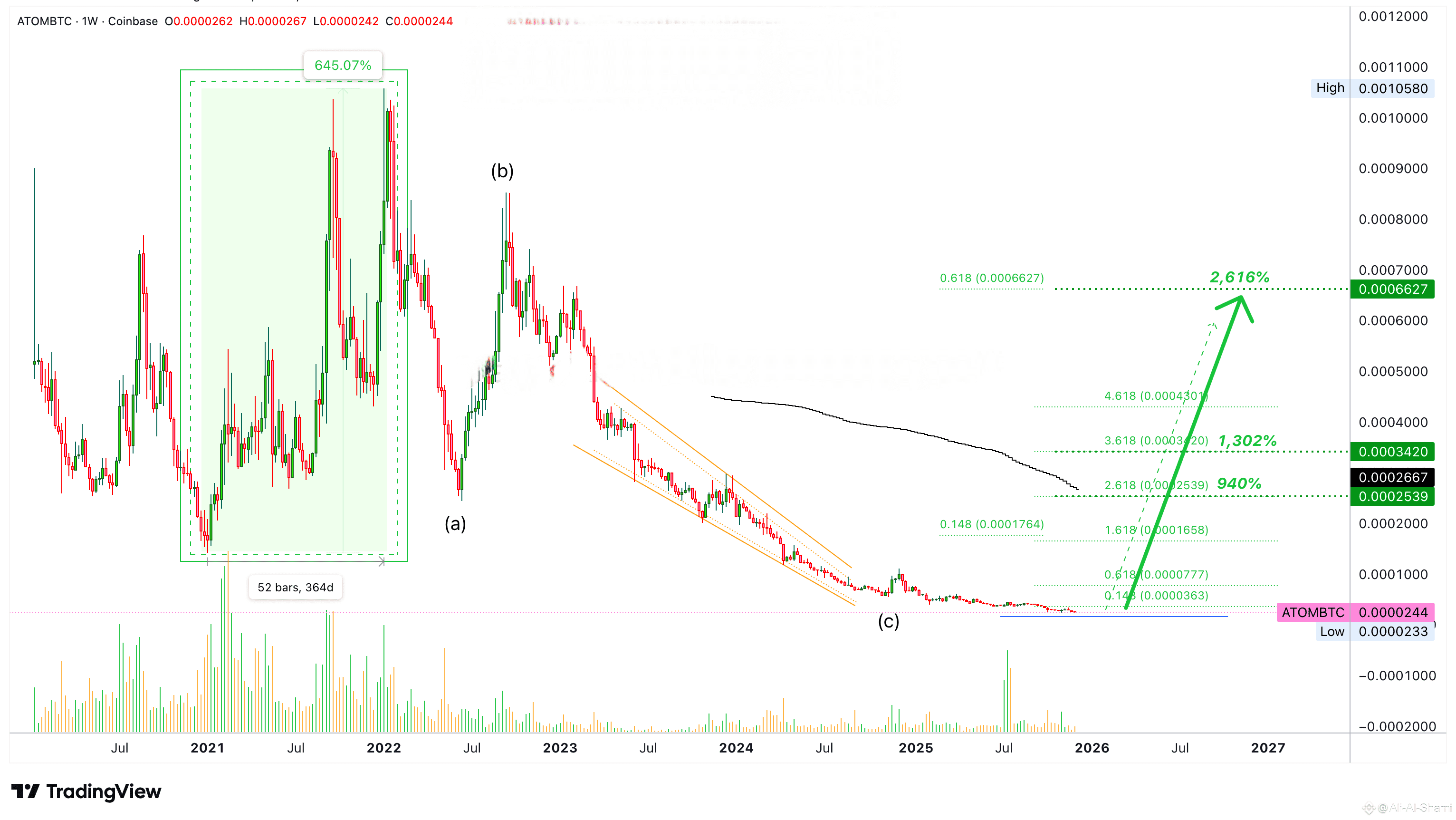 بعد تحدي MA200، يمكن أن يكون هناك تصحيح أو تراجع يتبعه نمو إضافي. لذا فإن ATOMBTC لديه إمكانات هائلة لأنه يتم تداوله عند قاع حقيقي. من القاع نبدأ بالنمو.