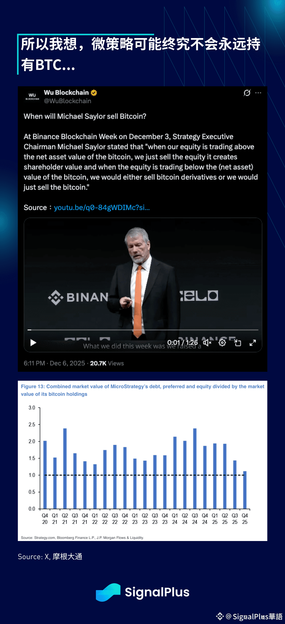更棘手的是,全球DATs的暴跌引发了市场对供应过剩以及在这些上市公司股价大幅低于其持有的BTC价值时可能引发强制抛售的广泛担忧。微策略(MSTR)面临的压力最大,目前该公司债务加股权的总价值与其持有的BTC价值相比,溢价已微乎其微。当被问及如果这一比率跌破1会发生什么时,塞勒给出了令人担忧的回答: