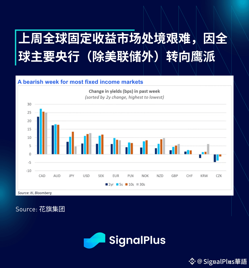 尽管上周风险情绪趋于稳定,但七国集团(G7)固定收益市场却经历了艰难的一周,因为多个非美国的一线经济资料意外向好。澳大利亚CPI同比上涨3.8%,高于预期的3.6%,导致其5年期国债收益率跳涨15个基点,澳元兑美元当月上涨2.5%。紧随其后的是加拿大的就业报告,表现极为强劲,远超预期(失业率为6.5%,预期为7.0%),这触发了加拿大5年期国债自2022年以来最剧烈的单日波动(+20个基点),加元也随之飙升2%。在日本,尽管资本支出疲软,但市场正在为日本央行本月加息的可能性定价,概率高达90%,这使得立场鸽派的美联储在G7中显得格格不入。