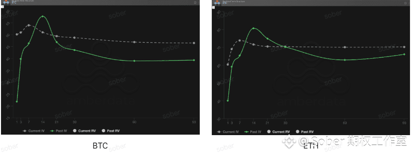 从期限结构来看,上周 BTC 与 ETH 的隐含波动率曲线并非典型的 Contango(近低远高)形态,而是出现了近端 IV 明显抬升、远端保持高位的“驼峰”式结构。