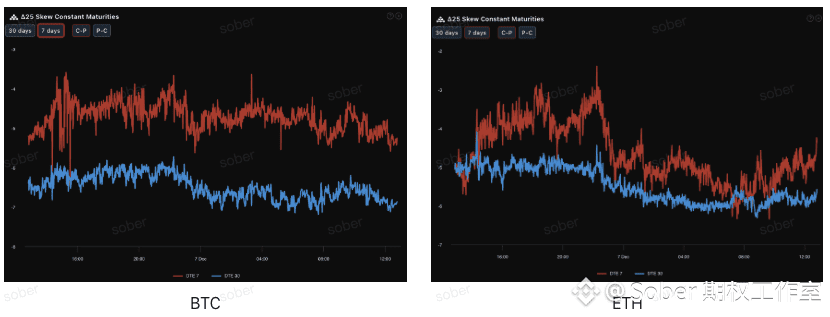 通过Delta 25 Skew(看涨期权隐含波动率IV - 看跌期权IV)观察,该指标的负值幅度反映了市场对下行尾部风险的对冲需求。