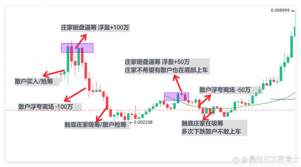 庄家获利无非就是你兜里的钱流向庄家兜里,但是主流币/一些有格局的庄家是不会一波割没的,这种情况用户自己割肉的概率比较大。