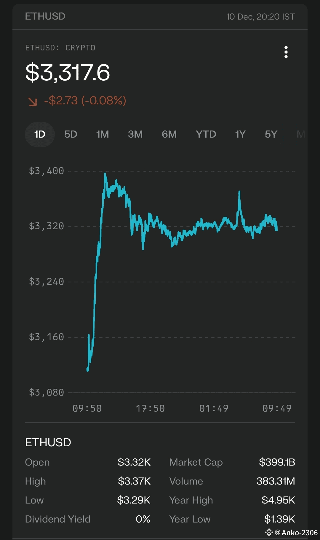 Based on the 1-day chart for Wednesday, December 10, 2025, Ethereum (ETH) is exhibiting a bullish short-term recovery trend, bouncing strongly from recent lows.Immediate Trend: Bullish RecoveryETH is trading around $3,322, reflecting a gain of approximately 6.3% in the last 24 hours . The price action on the daily timeframe indicates a significant reversal from the correction experienced throughout November. After bottoming out at $2,799 on December 2, ETH has rallied roughly 18% over the past week, reclaiming the psychological $3,000 level and breaking above immediate resistance zones .Key Technical Levels (1D Chart)Market Context & IndicatorsMomentum: The daily chart shows strong buying momentum, with a "green" impulsive candle today following a consolidation phase between December 6–8 . This suggests buyers are stepping in aggressively after the price stabilized above $3,000.Correction Context: The current move is a recovery from a steep ~28% pullback that occurred between early November (peak of $3,910) and early December . The ability to hold the $2,800 level was pivotal in preventing further downside.Outlook: A daily close above $3,400 would confirm a continuation of this recovery, potentially opening the path toward $3,600. However, failure to break this resistance could lead to a retest of the $3,100 support level.