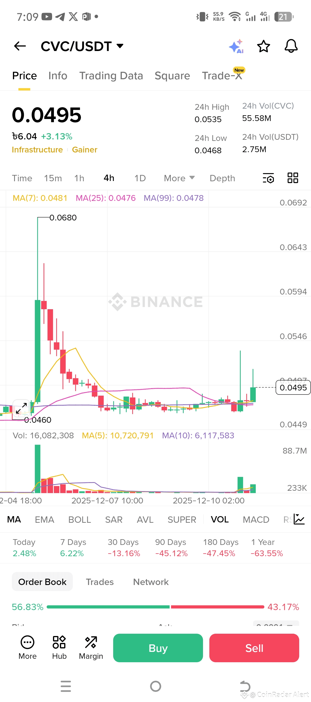 Yo, crypto squad – if you're not glued to your screens right now, you might wanna fix that because $CVC is straight-up flashing neon "BUY ME" signals on this Binance chart, and I'm here to break it down like we're grabbing drinks after a big win. 😎 Look, we've got this bad boy pumping +3.1% to $0.0495 in the last 24 hours, shrugging off the broader market noise like it's no big deal. That green candle action? Chef's kiss. It's bouncing hard off the lower Bollinger Band after testing that sweet $0.0468 low, and the volume is lighting up like a fireworks show – over 16 million in trades, with that massive green bar screaming accumulation from the smart money while the weak hands bailed.