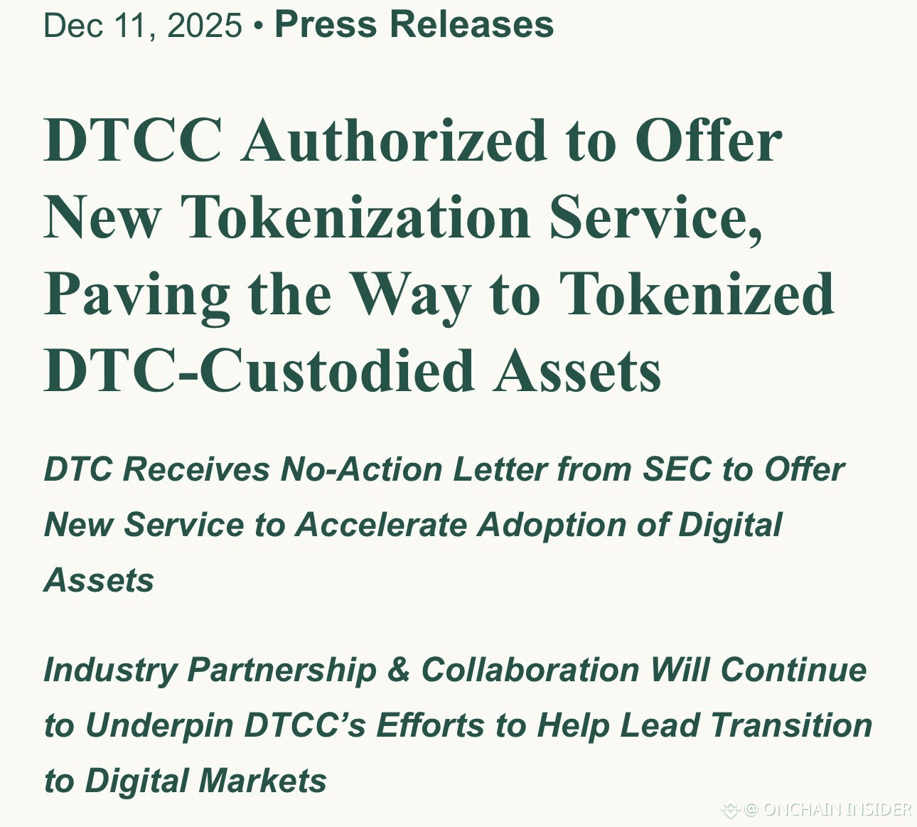 - DTCC, a cornerstone of the U.S. financial system, is introducing a service to tokenize assets held in its custody (e.g., stocks, bonds, or other securities). This bridges the gap between traditional finance (TradFi) and decentralized finance (DeFi), allowing institutional players to adopt blockchain technology for asset management.