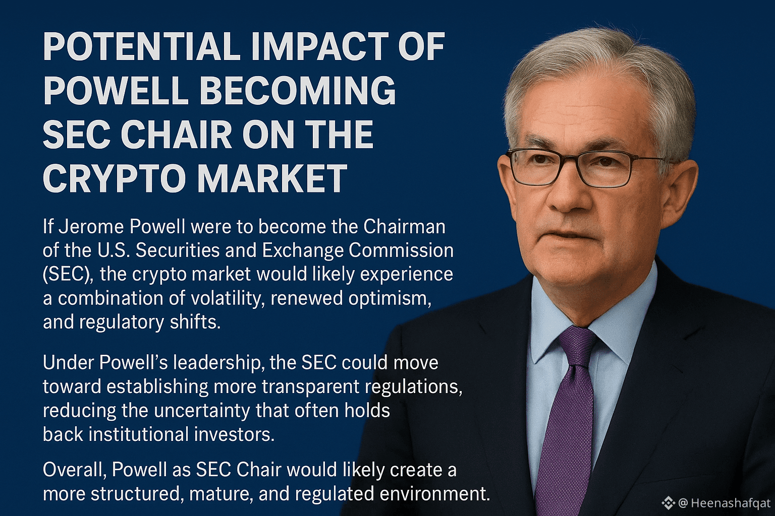 If Jerome Powell were to become the Chairman of the U.S. Securities and Exchange Commission (SEC), the crypto market would likely experience a combination of volatility, renewed optimism, and regulatory shifts. Powell has previously shown a balanced but cautious approach toward digital assets during his time at the Federal Reserve. He recognized crypto as an innovative technology but consistently emphasized the need for clear rules, investor protection, and market stability.