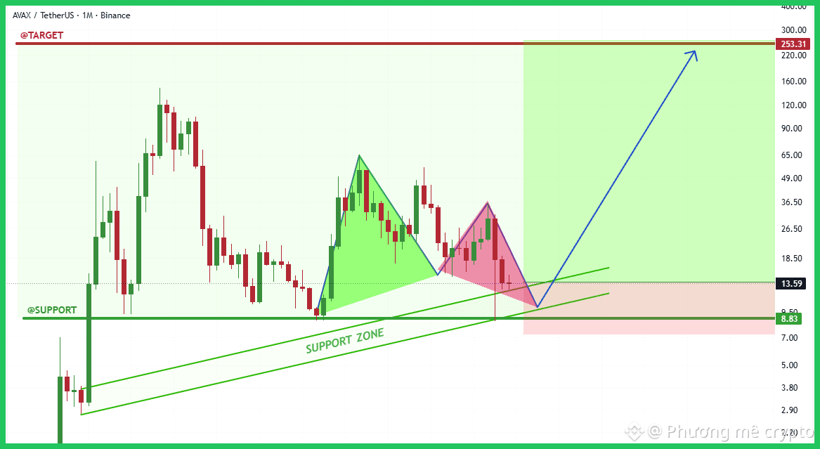 Phân tích Kỹ thuật: Biểu đồ cho thấy giá đã điều chỉnh mạnh và đang tiệm cận vùng hỗ trợ đáy quan trọng. Vùng hỗ trợ chính (SUPPORT ZONE) nằm trong khoảng $8.83 đến $13.59. Đây là khu vực hợp lưu giữa đường hỗ trợ ngang mạnh và đường xu hướng tăng dài hạn. Việc giá đang vẽ một mô hình tiềm năng để kiểm tra lại vùng $8-$9 là cơ hội VÀNG để tích lũy. Mục tiêu trung hạn có thể là $36, và mục tiêu dài hạn nếu thị trường Bull Run thực sự là $253.31 như trên chart.