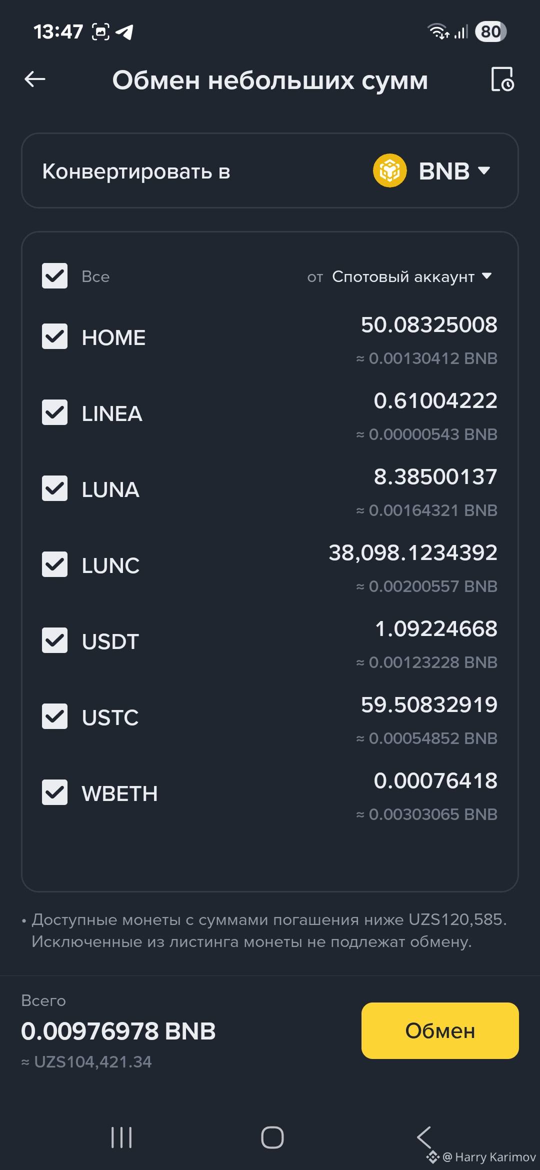 Что я сделал: Я использовал функцию Binance "Конвертировать активы с низкой стоимостью в BNB".