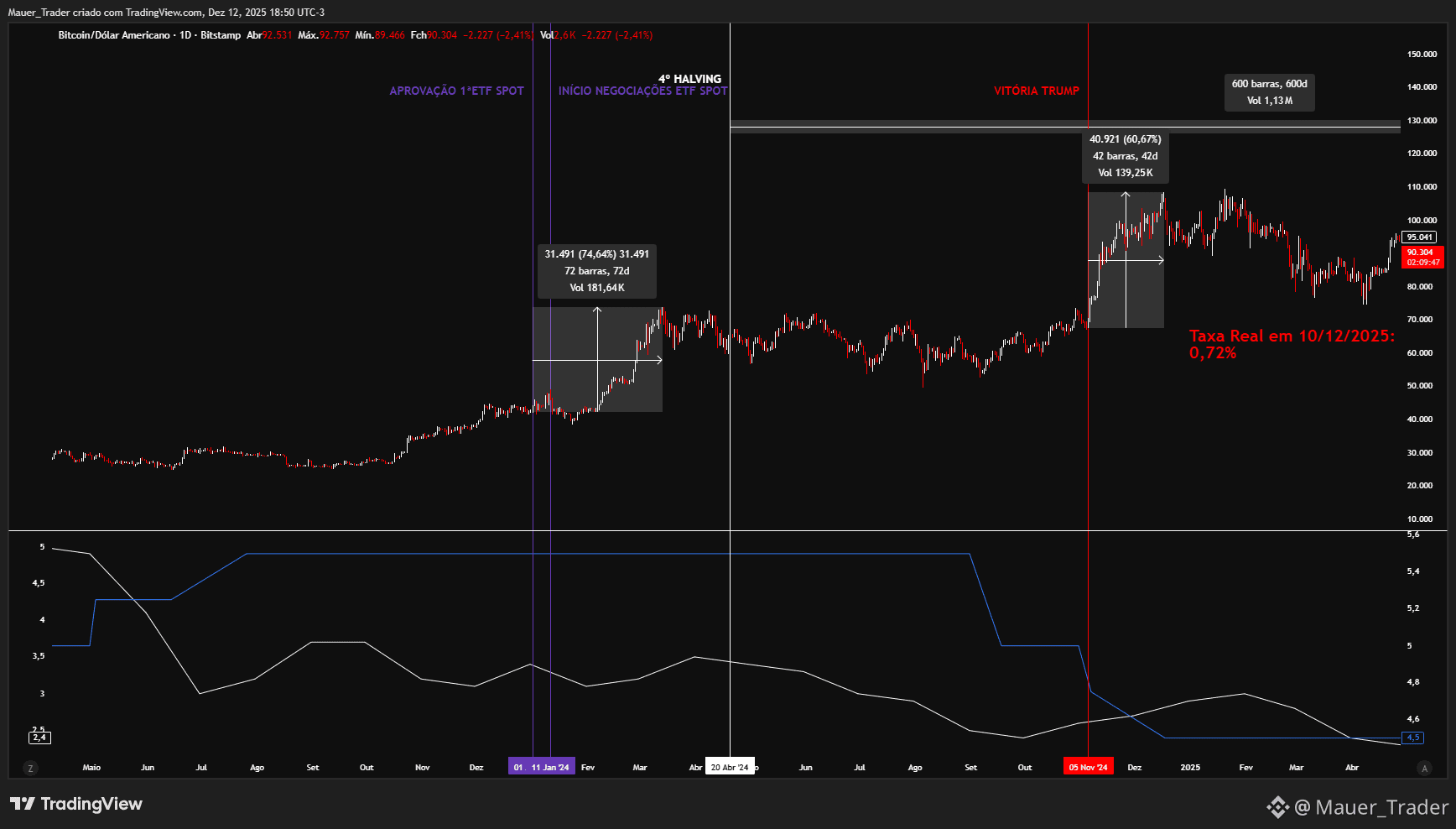 Neste ciclo, o principal catalisador inicial não foi a redução de oferta provocada pelo halving, mas sim o fluxo estrutural dos ETFs spot de Bitcoin, amplificado por uma mudança relevante no cenário político norte-americano, que alterou expectativas regulatórias e de fluxo.