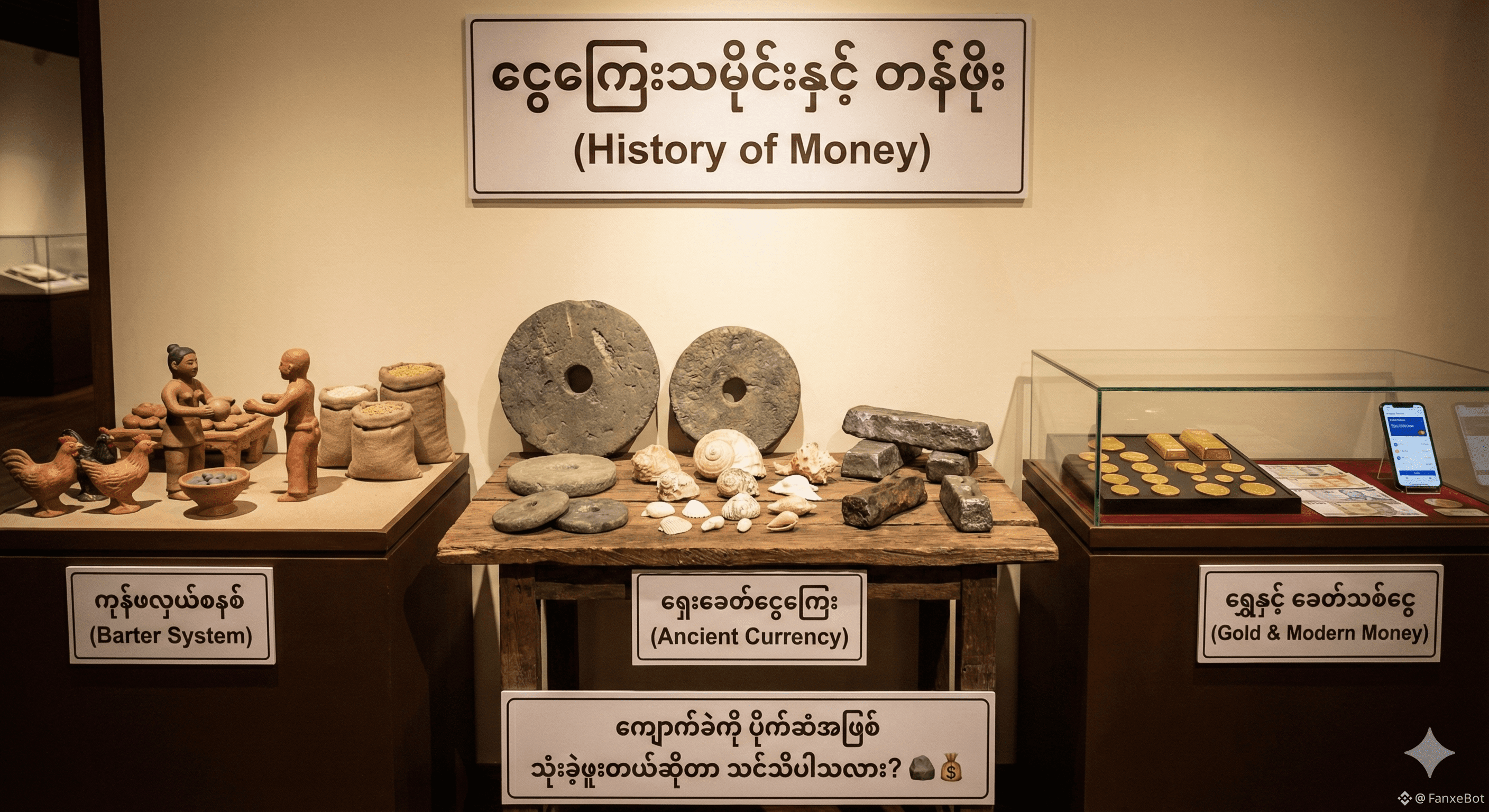 Crypto အကြောင်း မပြောခင် "ပိုက်ဆံ" ဆိုတာ ဘာလဲဆိုတာ အရင်သိဖို့ လိုပါလိမ့်မယ်။ ရှေးခေတ်တုန်းက လူတွေဟာ ကိုယ်လိုချင်တာရဖို့ ကိုယ့်ဆီမှာ ရှိတာနဲ့ လဲလှယ်ခဲ့ကြတယ် (Barter System)။ ဥပမာ - ကြက်တစ်ကောင် လိုချင်ရင် ဆန်တစ်တင်း ပေးရတာမျိုးပေါ့။
