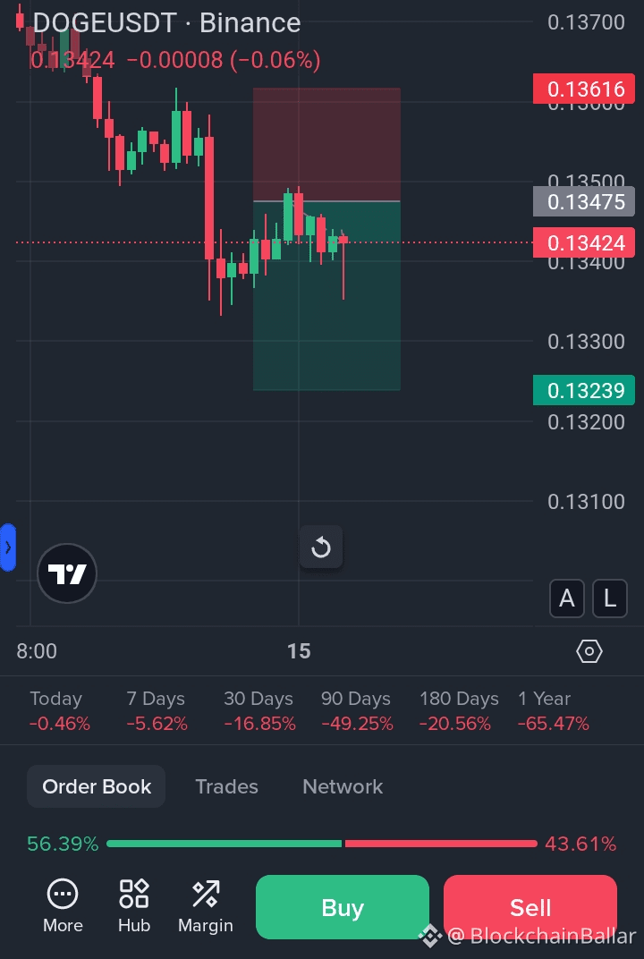 The DOGE/USDT chart on Binance indicates that the coin has been experiencing a downward trend. The current price is 0.13424, showing a decrease of -0.06%, suggesting selling pressure in the market.