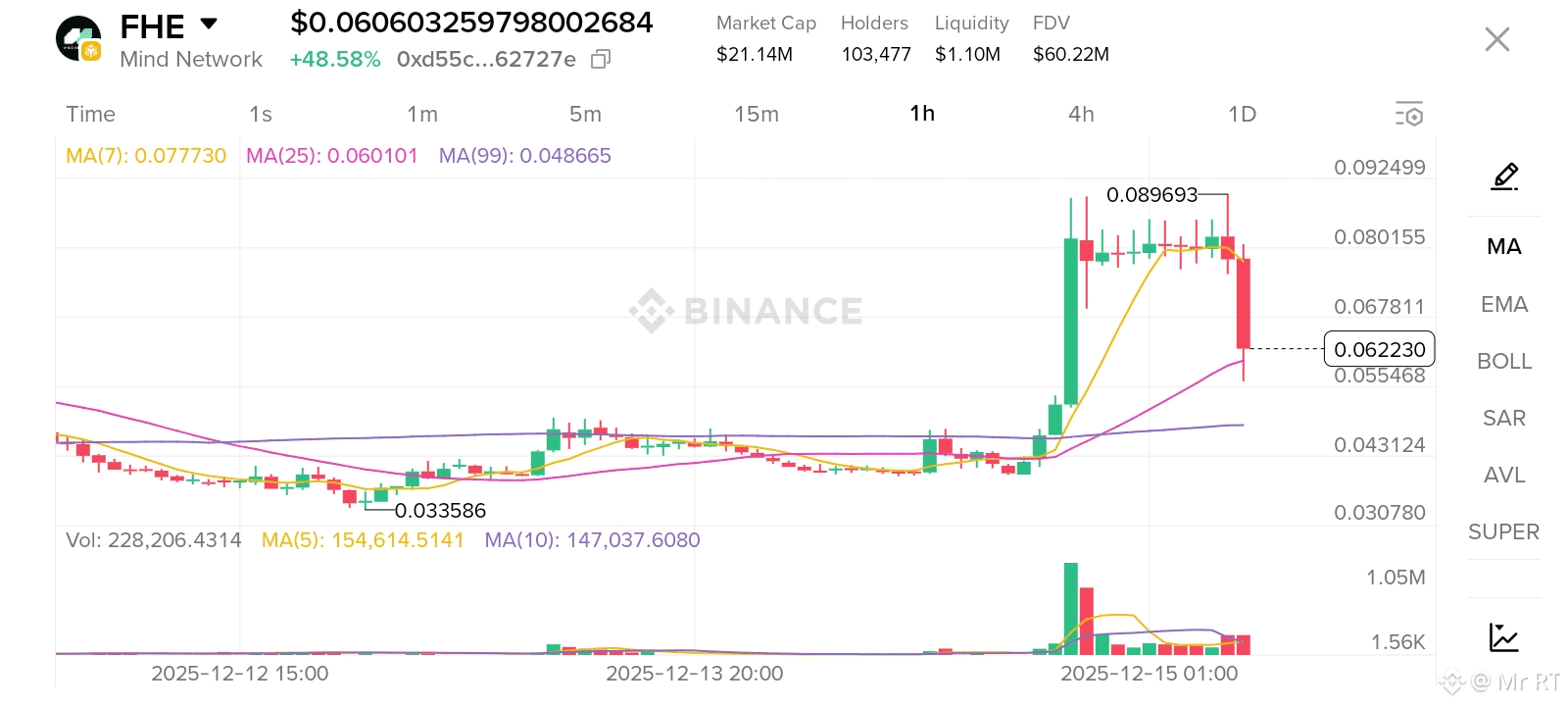 * Chart Summary: FHE surged from a low near $0.033586 to a high of $0.089693, a move that was supported by a large spike in trading volume. Currently, the price has dropped back to around $0.060603 but is maintaining a day-to-day gain of +48.58%. The price is consolidating around the rising Moving Averages, which are acting as a support floor after the rapid sell-off.