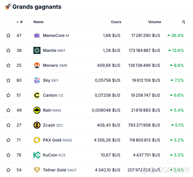 Si on zoom en regardant les performances des actifs, on s’aperçoit que seulement quelques rares altcoins parviennent à s’exprimer. Deux actifs enregistrent des hausses de plus de 10 % en une semaine : MemeCore (M) et Mantle (MNT). Ils grimpent respectivement de 36,4 % et de 13,6 % :