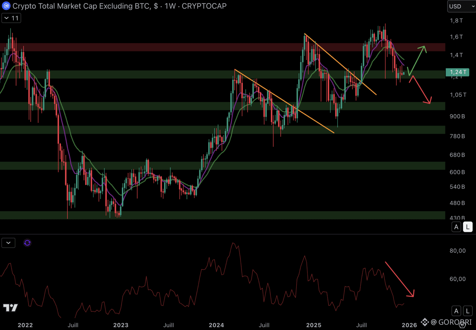 Le cours pourrait bloquer entre les moyennes mobiles (EMA 9/EMA 18) baissières. Et si c’est le cas, la capitalisation des altcoins pourrait chuter vers le support à 980 milliards de dollars. Mais si un bottom se met en place autour du support à 1 200 milliards de dollars, un rebond pourrait ramener le cours au niveau de la résistance à 1 500 milliards de dollars. Depuis le top trouvé à 1 800 milliards de dollars, ce sont les vendeurs qui ont la main.