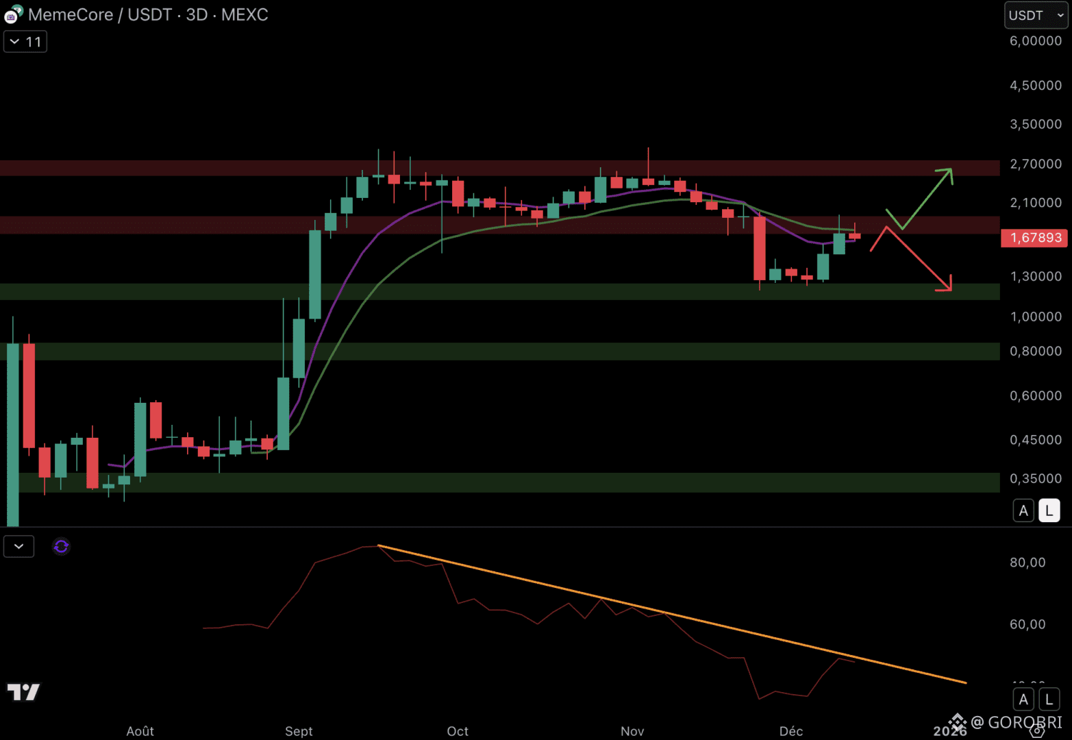 Le trio de tête est complété par Monero (XMR) qui progresse de 8,8 % en une semaine. Allons tout de suite analyser la situation technique de MemeCore (M) et voir s’il est capable de continuer de grimper dans les prochaines semaines.