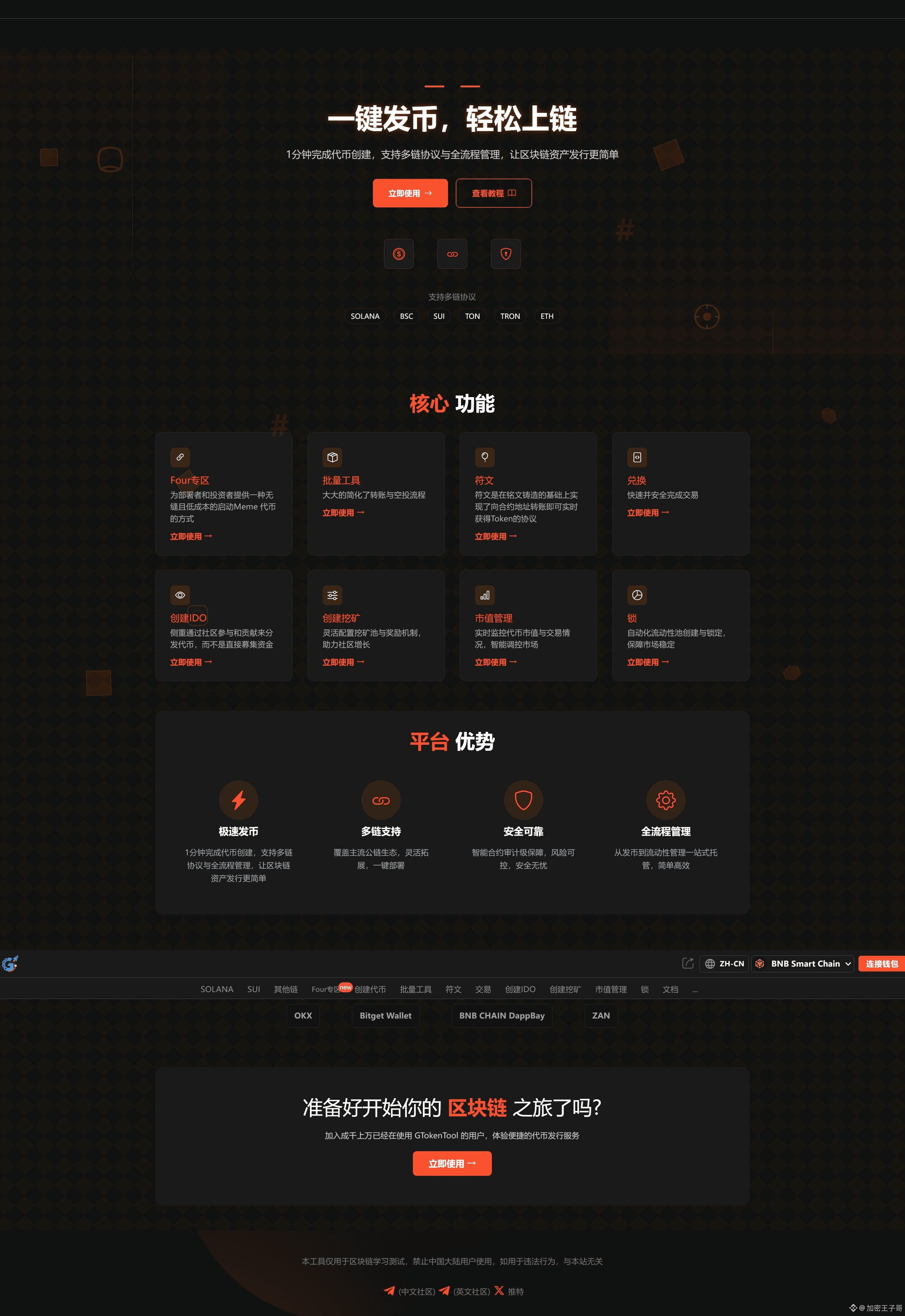 GTokenTool是功能最全的一键发币工具,支持TON、SOL、BSC等多条公链。功能:创建代币、市值管理、批量空投、代币预售、IDO、锁、质押挖矿等。提供可视化的界面,让用户能够快速创建、部署和管理自己的加密货币,而无需编写代码。GTokenTool是有+4年经验的专业发币大平台,拥有活跃的官方社区和专人客服。