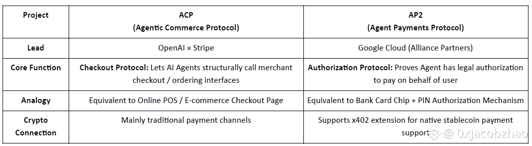 Ordering Layer: Responsible for "How orders are expressed and verified". ACP (OpenAI × Stripe) provides a structured description of goods, prices, and settlement terms to ensure merchants can fulfill contracts. Since it is difficult to express real-world commercial contracts on-chain, this layer is basically dominated by Web2.