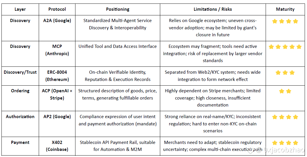 Based on the introduction of the core protocol stack of Agentic Commerce, the following table summarizes the positioning, core capabilities, main limitations, and maturity assessment of the protocols at each level, providing a clear structural perspective for building a cross-platform, executable, and payable agent economy.