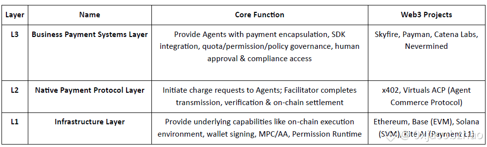 Currently, the Web3 ecosystem of Agentic Commerce can be divided into three layers: