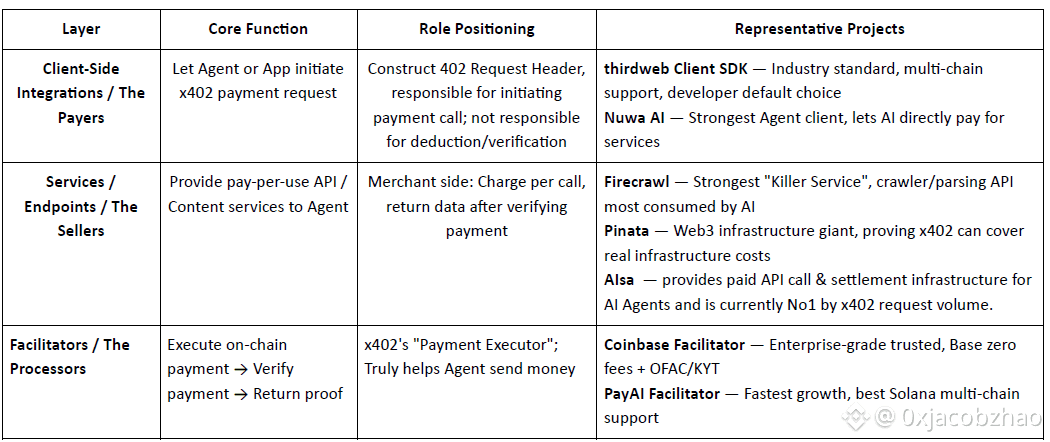 Facilitators / The Processors: Complete on-chain deduction, verification, and settlement. The core execution engine of x402. Representative projects: