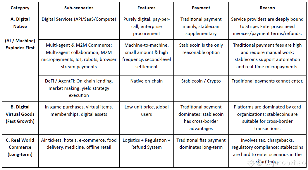 The core obstacle to the scaling of stablecoins in real-world commerce is not just technology, but regulation (KYC/AML, tax, consumer protection), merchant accounting (stablecoins are non-legal tender), and the lack of dispute resolution mechanisms caused by irreversible payments. Due to these structural limitations, it is difficult for stablecoins to enter high-regulation industries such as healthcare, aviation, e-commerce, government, and utilities in the short term. Their implementation will mainly focus on digital content, cross-border payments, Web3 native services, and machine economy (M2M/IoT/Agent) scenarios where regulatory pressure is lower or are native on-chain—this is precisely the opportunity window for Web3-native Agentic Commerce to achieve scale breakthroughs first.