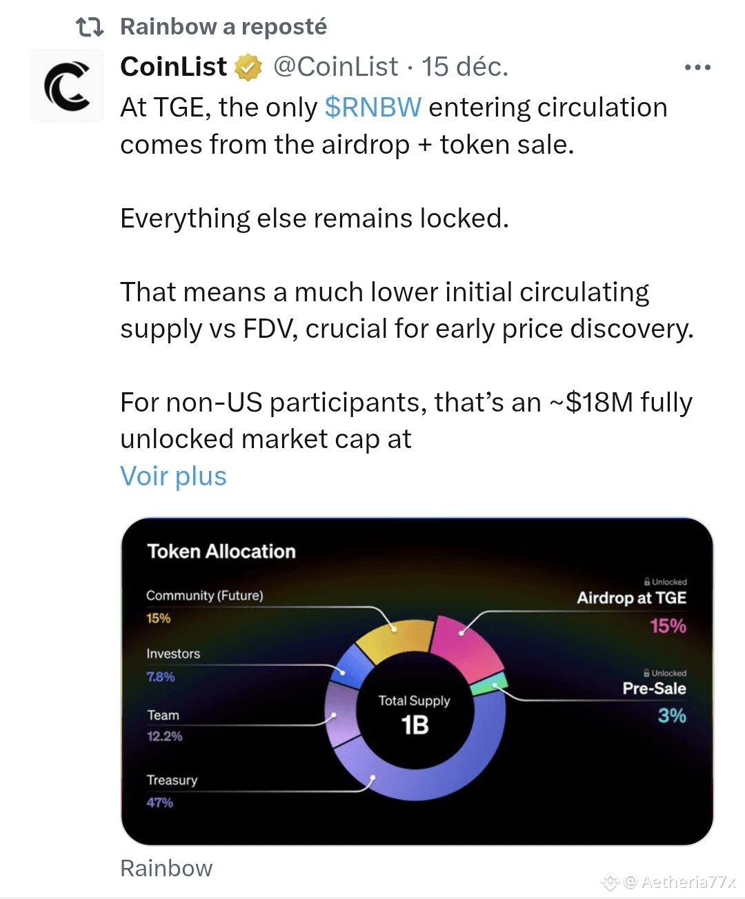 🔸️Le scoop : La quantité de jetons $RNBW mise en circulation initialement est très faible (seulement 15% via l’airdrop et 3% via la prévente). C'est un facteur clé pour une potentielle découverte de prix intéressante.