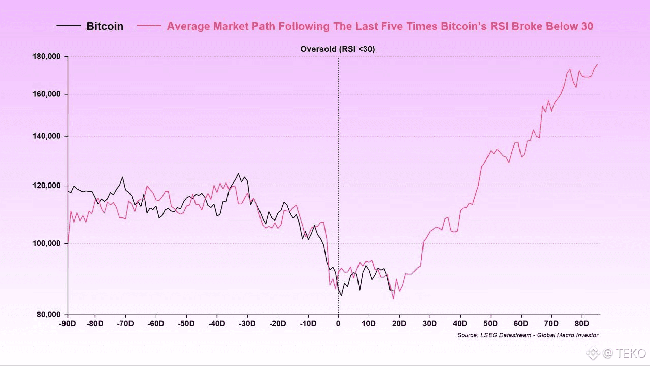 من جهة أخرى، إذا نظرت للبيتكوين بنظرة بولش، فالحركة الحالية ما زالت منسجمة مع المسار التاريخي للـ RSI بعد الدخول في مناطق التشبع البيعي (أقل من 30)، حيث غالباً ما يتبعها ارتداد قوي على المدى المتوسط.