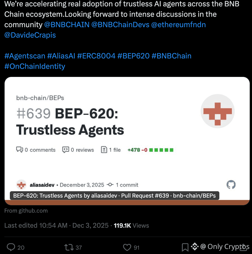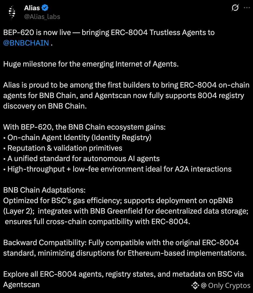 BEP-620 Launches Trustless Agents Standard on BNB Smart Chain: BEP-620 brings the ERC-8004 “Trustless Agents” model to BNB Smart Chain, defining on-chain registries for agent identity, reputation, and validation. This lays the groundwork for autonomous AI agents and services to build verifiable reputations directly on BNB Chain and opBNB.