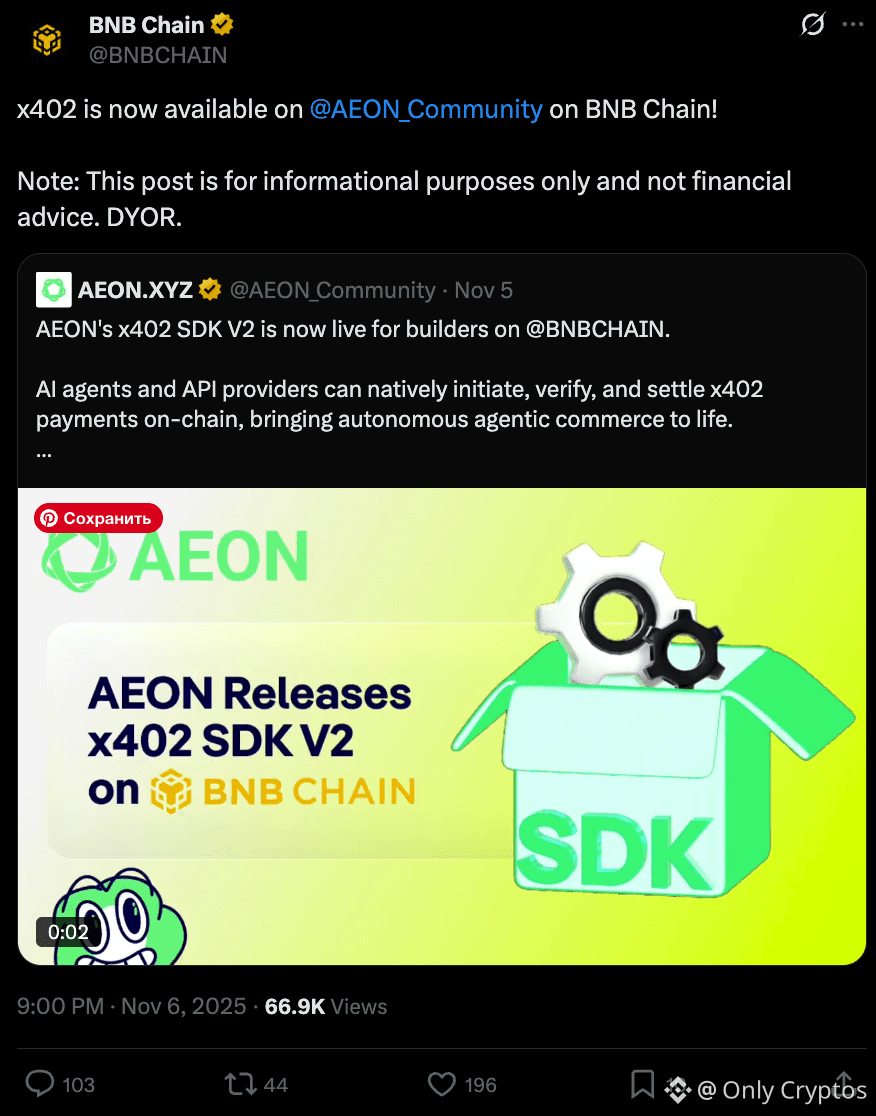 AEON’s x402 SDK V2 Goes Live for AI Payments on BNB Chain: AEON released x402 SDK V2 on BNB Chain, enabling AI agents and API providers to initiate, verify, and settle payments natively on-chain using the x402 standard. The rollout follows AEON surpassing $29 million in processed AI payment volume, reinforcing BNB Chain’s role in the emerging agentic economy.