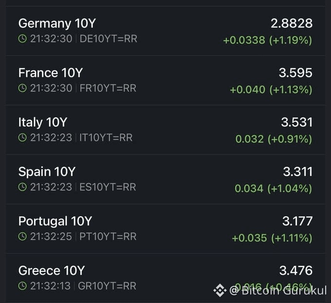 If you check the numbers from European government bonds today, you'll notice a clear pattern emerging. German 10-year yields have climbed to 2.88%, up over 1%. French bonds are sitting at 3.59%, also rising more than 1%. Italy's at 3.53%, Spain at 3.31%, Portugal at 3.17%, and even Greece is showing movement at 3.47%.