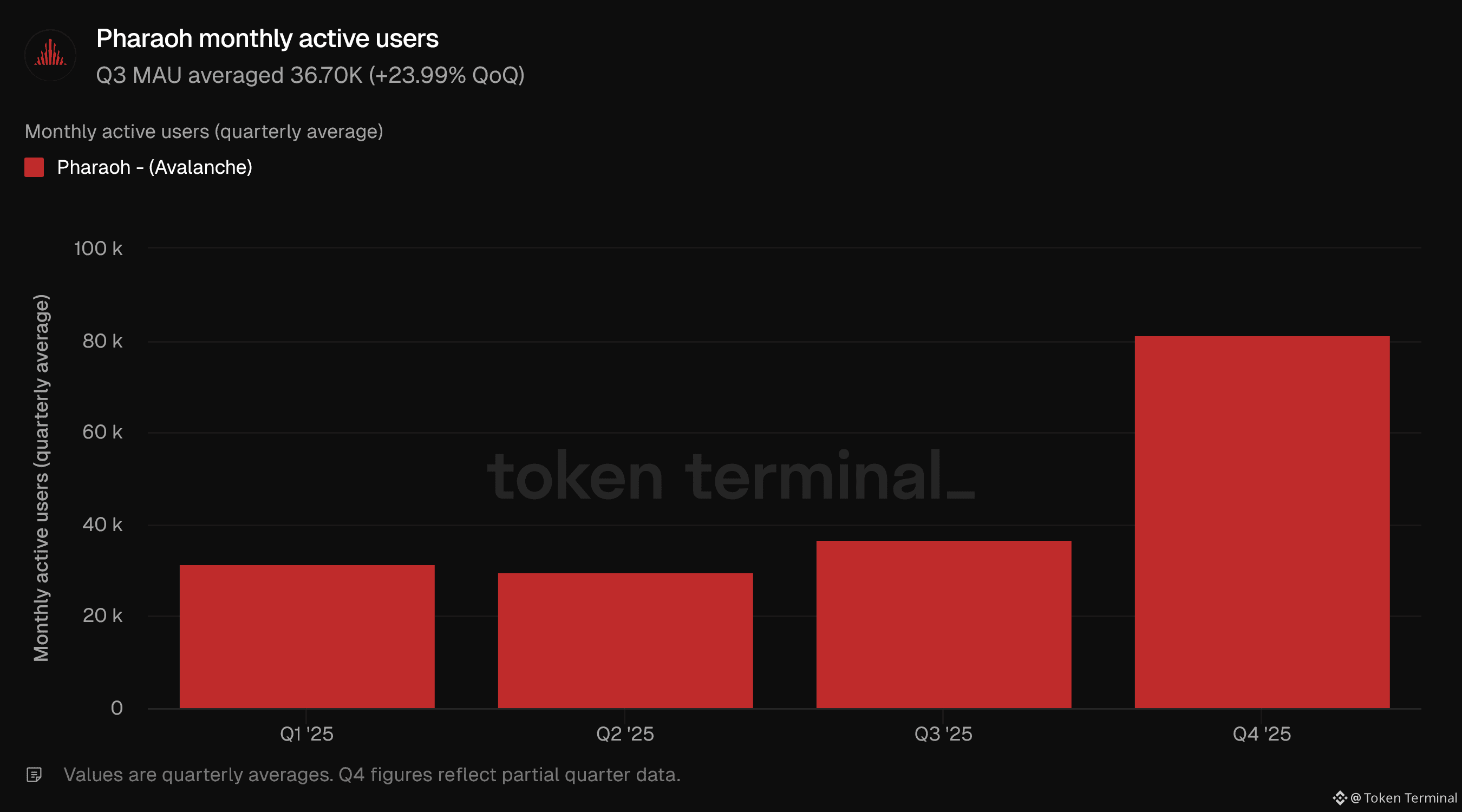 Pharaoh, founded in 2023, is an Avalanche-native DEX. In Q3 2025, the project used a concentrated liquidity model (v2), alongside legacy AMM pools (v1), with a ve(3,3) governance model that distributes token incentives based on user votes. Pharaoh saw growth across most key metrics, with TVL, trading volume, fees, and monthly active users all increasing quarter-over-quarter, while token incentives declined. The project has since upgraded to v3 in Q4 2025.